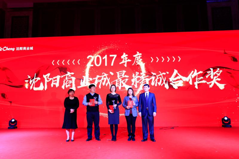 活動現(xiàn)場,陳哲元董事長、鐘靜總經(jīng)理代表沈陽商業(yè)城向萃華金店、周大福品牌、遼寧和慧倉商貿、影兒會所頒發(fā)了2017年度最精誠合作獎。